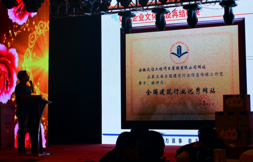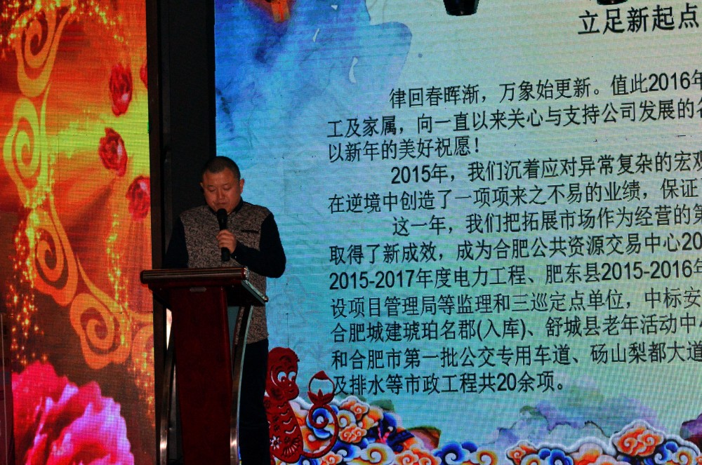 年會上,朱敏回顧了2015年的十件大事,再現了2015年公司經營發展的重要瞬間及主要成果。他回顧說,2015年,公司在我國經濟持續下行和行業形式復雜變化的背景下,準確把握宏觀形勢,找準市場的切入點,奮發有為,在逆境下保持了公司在新常態下的平穩運行。在這一年里,公司遷入了新的辦公場所、成為了臨泉重點局第三方質量安全巡查的定點單位、企業報及網站均獲得了全國建筑行業優秀的榮譽、位列“安徽省建設監理行業30強”第18位、為含山縣陶廠鎮司徒小學的孩子們送去了溫暖......無論是企業業務范圍,還是企業文化的培育,亦或是團隊的專業技術能力都取得了突破性進展。他希望全體遠信人在2016年繼續奮進,取得更優秀的成果。
