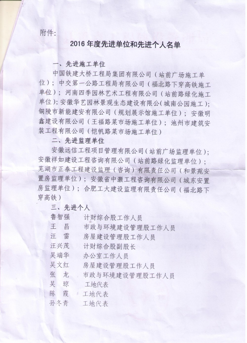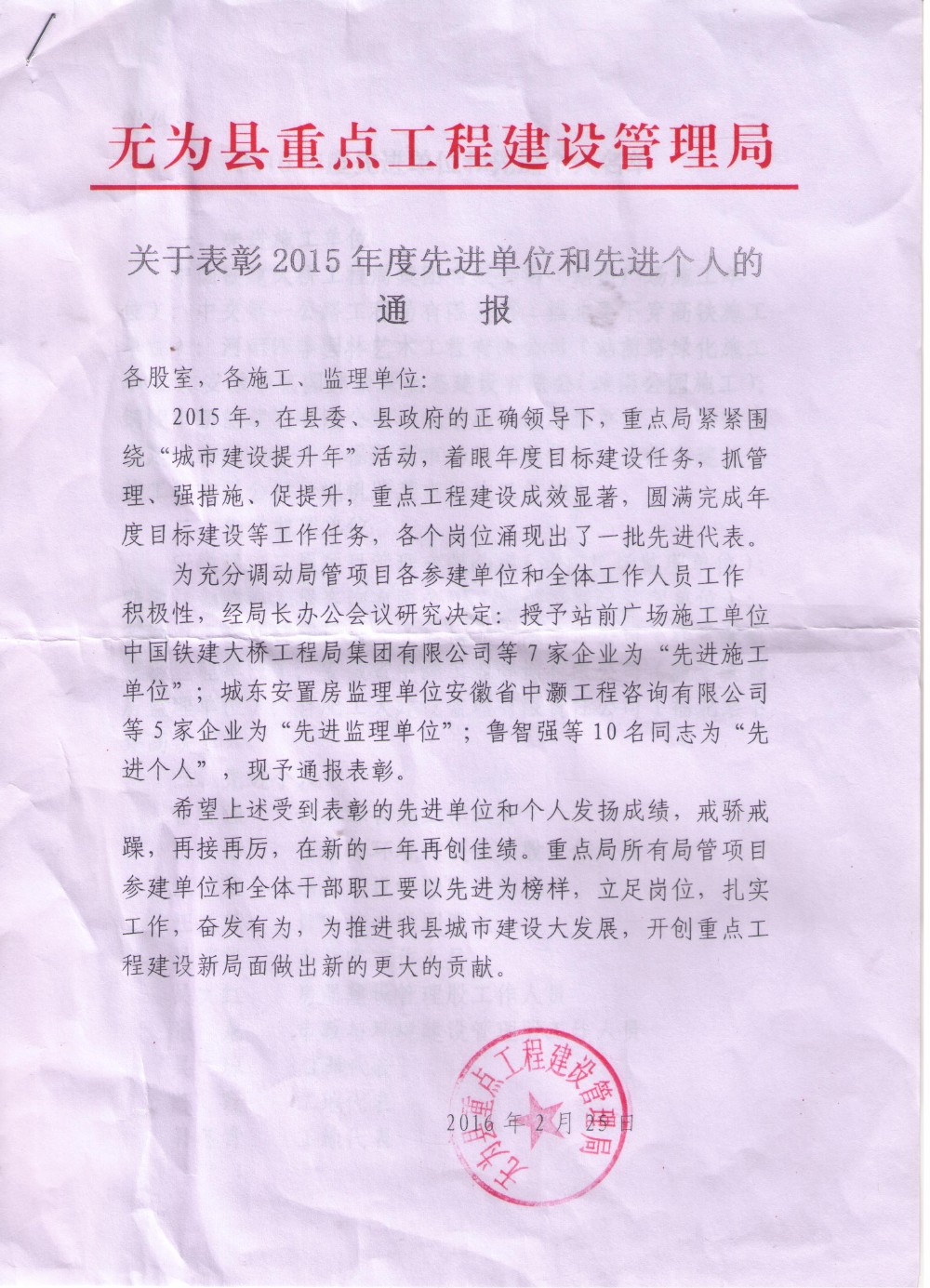 2月29日,無為縣重點工程建設(shè)管理局發(fā)布《關(guān)于表彰2015年度先進單位和先進個人的通報》,授予我公司“先進監(jiān)理單位”稱號。