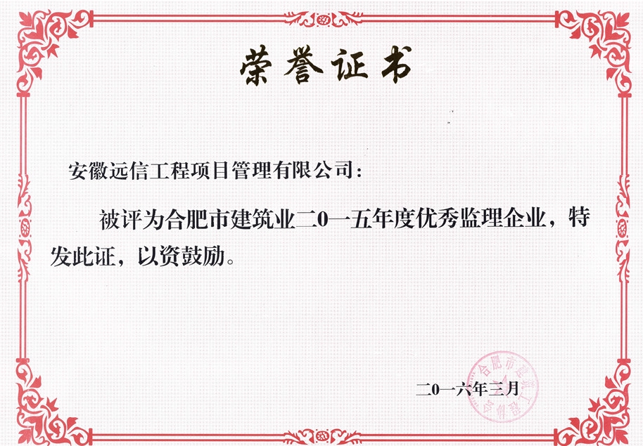 近日,合肥市城鄉建設委員會正式發布《關于表彰全市建筑業2015年度優秀企業、單項先進企業、先進個人的決定》,公司被評為“合肥建筑業2015年度優秀監理企業”,這是公司連續第三年度獲此殊榮。與此同時,公司總監張勇、趙賢禮、章素梅3人被評為“合肥建筑業2015年度優秀總監理工程師”。
