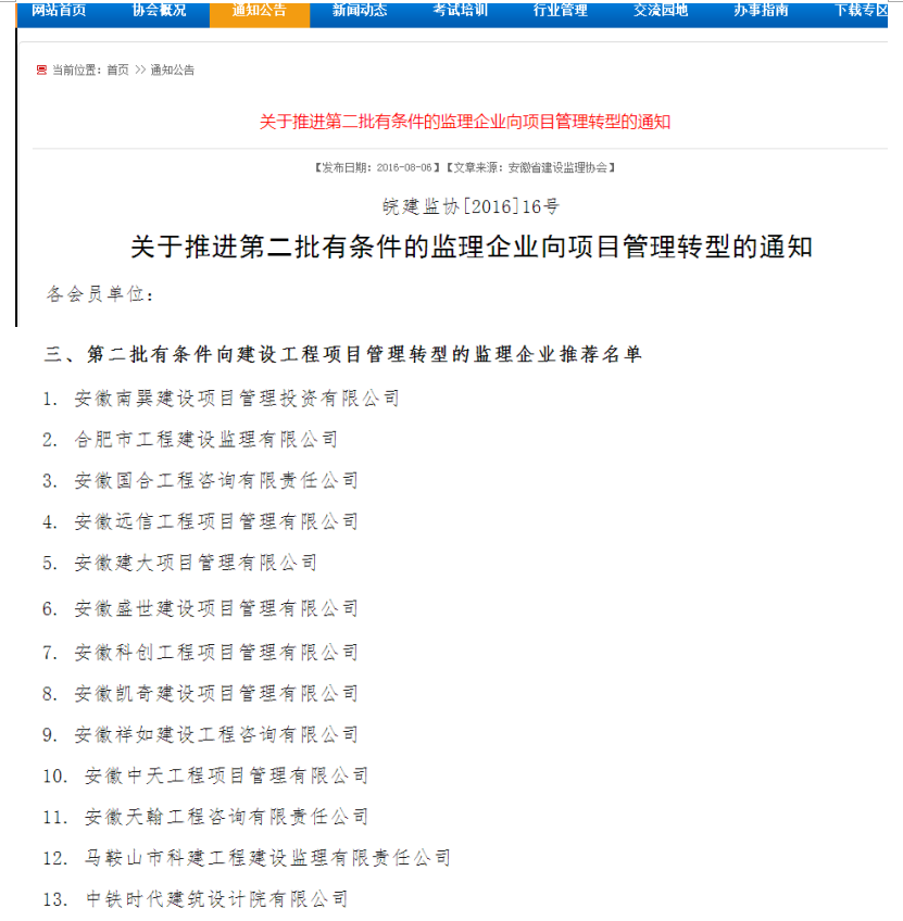2015年10月,安徽省建設監理協會公布了第一批15家有條件向項目管理轉型的監理企業后,在全省范圍內引起了行業和各級政府高度重視,合肥及安慶等地區在一些公建項目及醫療衛生領域已逐步推廣項目管理(監理)招標服務。