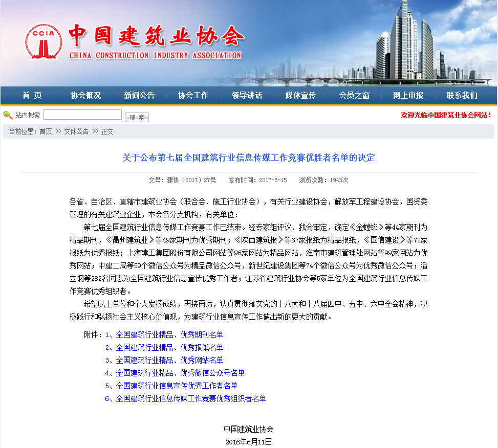 公司網站及報紙再次蟬聯"全國建筑行業優秀網站"及"優秀報紙"稱號