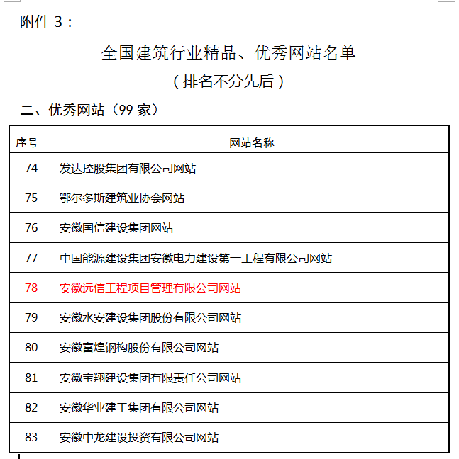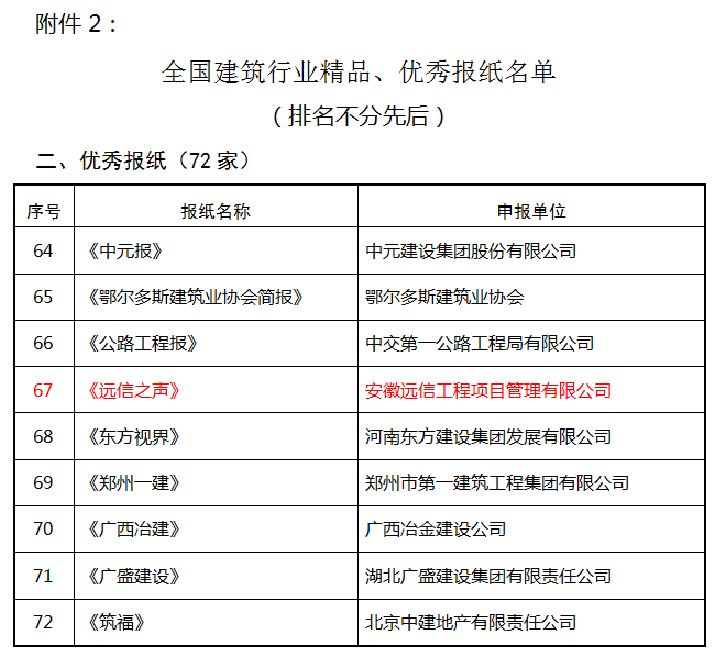 日前,中國建筑業協會公布了第七屆全國建筑業信息傳媒工作競賽結果,公司網站及報紙《遠信之聲》在全國眾多優秀建筑企業選送的參賽作品中脫穎而出,分別榮獲“全國建筑行業優秀網站”及“全國建筑行業優秀報紙”稱號。此次已是公司網站連續第四次、公司報紙連續第三次蟬聯該獎項。該獎項是經各省(直轄市)建筑業協會推薦,中國建筑業專家評審會最終審定,評審標準十分嚴格。