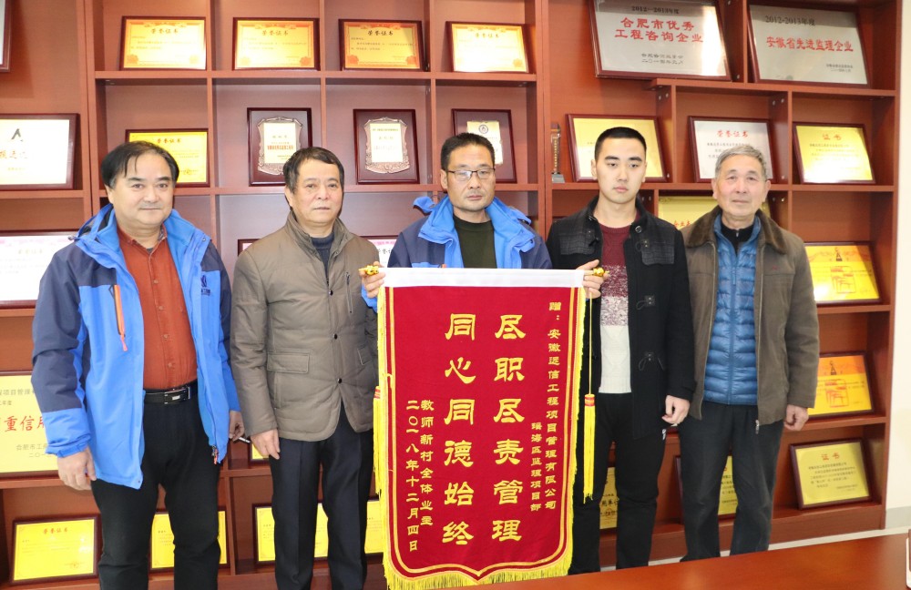 12月24日下午,教師新村的兩位業主代表、振凱園林公司代表專程來到安徽遠信,將一面寫有“盡職盡責管理,同心同德始終”的錦旗交于公司常務副總兼總工郝傳山的手中,再三感謝公司在教師新村環境綜合整治項目監理工作中盡職盡責的專業表現。隨后,郝總與代表們進行了親切交談。