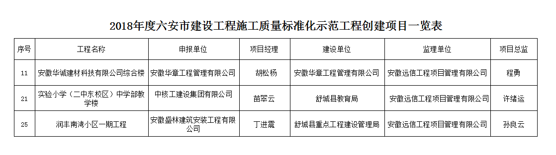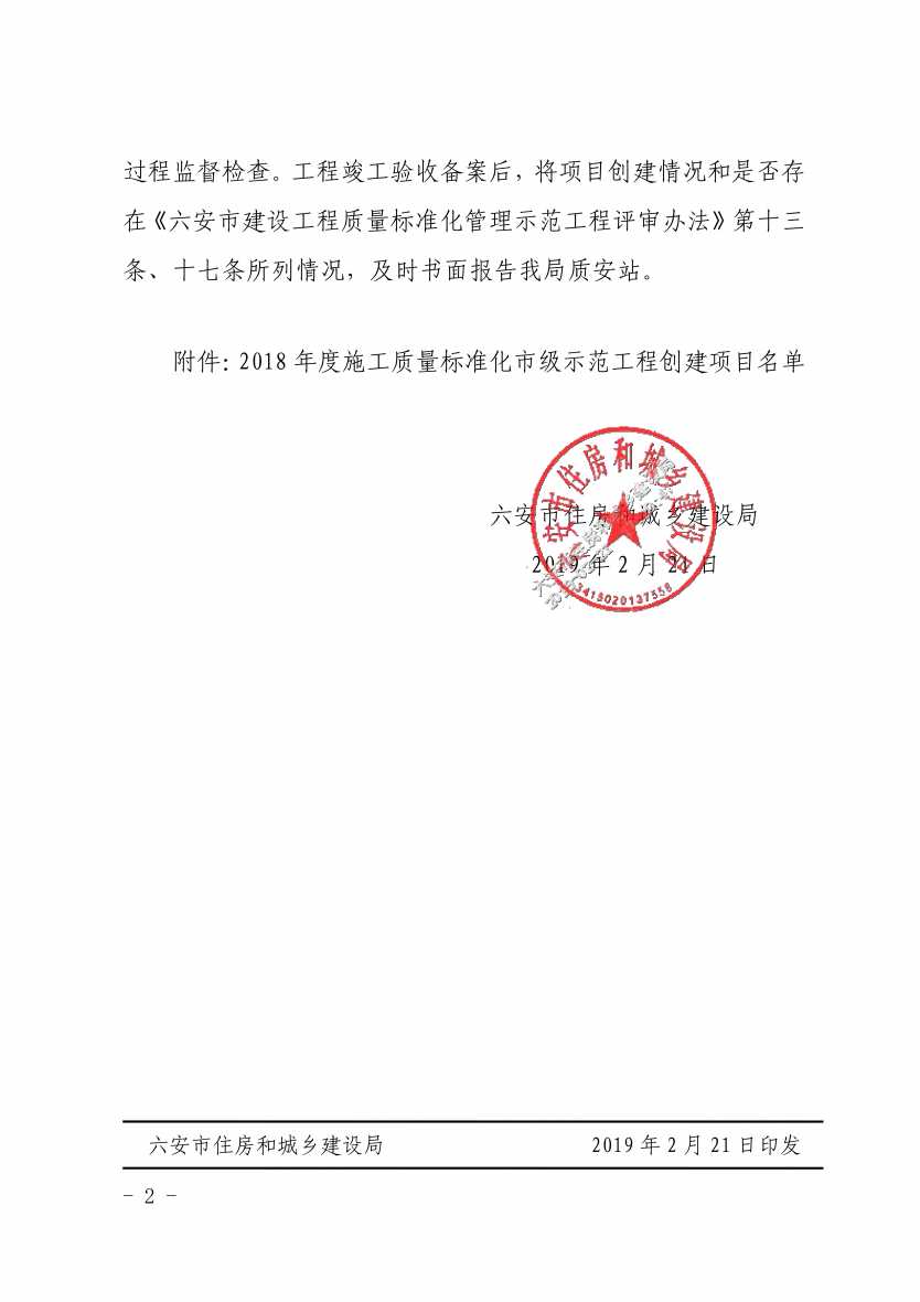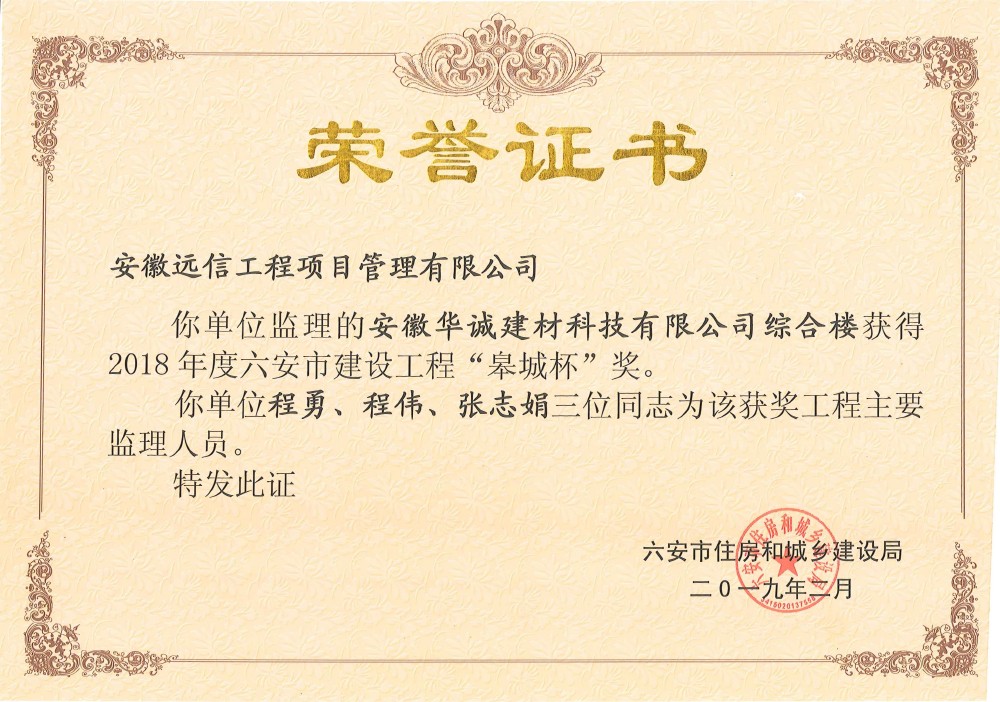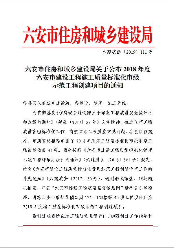 近日,六安市住房和城鄉建設局發布《六安市住房和城鄉建設局關于發布2018年度六安市建設工程“皋城杯”獎獲獎項目名單的通知》及《六安市住房和城鄉建設局關于公布2018年度六安市建設工程施工質量標準化市級示范工程創建項目的通知》,公司監理的7個項目分別榮獲六安市建設工程“皋城杯”獎和六安市建設工程施工質量標準化市級示范工程兩項殊榮。