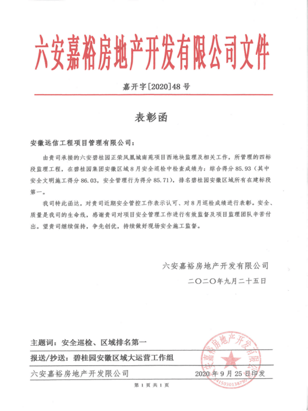 近日,在碧桂園集團安徽區域公司開展的8月安全巡檢評比活動中,由安徽遠信監理的六安碧桂園正榮鳳凰城南苑項目以突出的質量、安全管理工作成效,位列碧桂園安徽區域所有在建標段評比第一名。